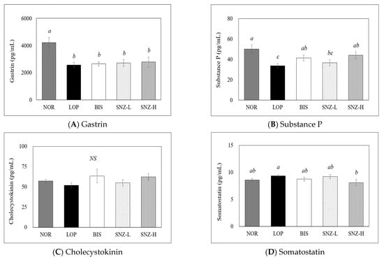 Effects of B. coagulans SNZ 1969 on plasma gastrointestinal hormones in loperamide-induced constipation rats. NOR: Normal group, LOP: Loperamide treated group; BIS: Loperamide and Bisacodyl 8 mg/kg treated group; SNZ-L: Loperamide and B. coagulans SNZ 1969 at 1 × 108 CFU/day treated group; SNZ-H: Loperamide and B. coagulans SNZ 1969 at 1 × 1010 CFU/day treated group. Concentrations of (A) Gastrin, (B) Substance P, (C) Cholecystokinin, (D) Somatostatin, and (E) Vasoactive intestinal peptide in plasma were estimated by ELISA. The results are presented as mean ± SE (n = 8). Means with the different letters above a bar are significantly different at p < 0.05 by Duncan’s multiple range test. NS: not significant.