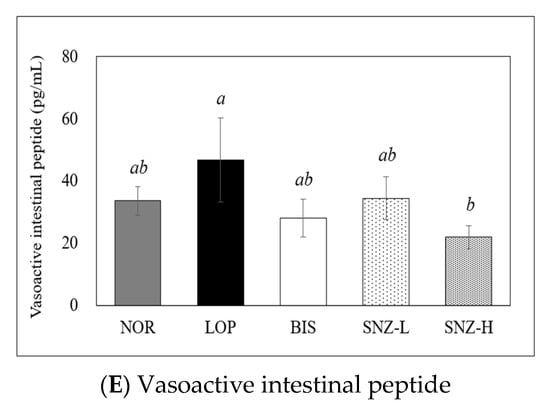 Concentrations of gastrin (Gas), substance P (SP), cholecystokinin (CCK), somatostatin (SS), and vasoactive intestinal peptide (VIP) in plasma samples of experimental animals are shown in Figure 6. The Gas level was significantly (p < 0.05) decreased in groups treated either with loperamide alone or loperamide with BIS or loperamide with SNZ treatment compared to that in the NOR group (Figure 6A). The SP level was significantly decreased in the LOP group compared to that in the NOR group but was significantly increased in the BIS group and the SNZ-H group compared to that in the LOP group (Figure 6B) (all p < 0.05). There was no significant difference in CCK concentration among groups (p = 0.415) (Figure 6C). The concentration of SS showed a significant decrease only in the SNZ-H group compared to that in the LOP group (Figure 6D) (p < 0.05). VIP concentrations in the BIS group, SNZ-L group, and SNZ-H group also tended to decrease compared to that in the LOP group, but statistical significance was found only in the LOP group and SNZ-H group (p < 0.05) (Figure 6E).
