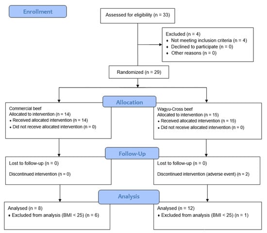 As mentioned above, the trial was double-blinded, and the volunteers, sample collectors, and researchers were not aware of the group of volunteers. The sample size calculation was based on the results described by Varady et al. [27] (α = 0.05, power = 0.8), which were performed on the basis of expected mean ± SD differences in weight loss between diet groups of 6.5% to determine the targeted final sample size (n = 6 in each group). After the survey, four participants were excluded because they did not meet the inclusion criteria. The remaining 29 volunteers were randomly assigned to either the control (n = 14; commercial beef) or the treatment (n = 15; Wagyu-Cross beef) for food interventions. However, to avoid any biases, the analysis was restricted to those volunteers with a BMI of ≥25 kg/m2, resulting in the following distribution, n = 8; commercial beef and n = 12 Wagyu-Cross beef.