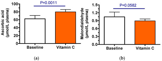 The baseline pharmacokinetic trial (control) was carried out, followed by 3.5 weeks of vitamin C supplementation, then the pharmacokinetic trial was repeated. Vitamin C supplements were effective in increasing plasma ascorbic acid concentrations (p = 0.0023, Figure 1a). MDA was measured to assess oxidative stress; these values were not significantly changed between the two trials (Figure 1b), although they were somewhat lover after vitamin C supplementation.