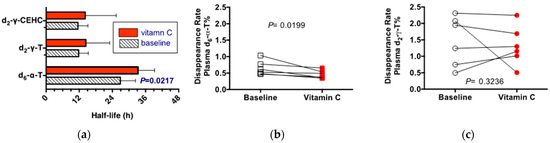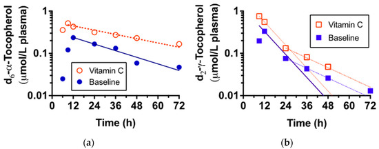 The entire data set were also calculated based on percentage labeled of either the total plasma α- or of γ-tocopherol concentrations, respectively. The purpose was to verify that the low plasma α-tocopherol concentrations observed in some participants did not affect the exponential rates of disappearance. The individual responses shown in Figure 3b,c illustrate the changes in response to vitamin C supplementation. Specifically, the exponential disappearance rates for d6-α-tocopherol were slower, but those for d2-γ-tocopherol were unchanged by vitamin C supplementation. These outcomes are similar to the responses to vitamin C supplementation that were observed when the rates were calculated based on plasma d6-α- and d2-γ-tocopherol concentrations.