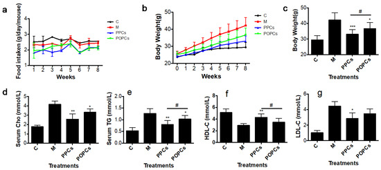 As the results showed in Figure 1a, the food intake of the mice in C groups was higher than that of the M group; the PPCs group was significantly lower than the M group (Figure 1a). The mice in HFD group showed a higher body weight than that in C group (42.17 ± 4.65 vs. 29.38 ± 2.86 g). The groups that administered with both of P-PCs and P-OPCs exhibited significant inhibitory potential in body weight (33.05 ± 3.02 vs. 42.17 ± 4.65 g and 36.65 ± 4.03 vs. 42.17 ± 4.65 g for PPCs and POPCs, respectively) (Figure 1b,c). In the meanwhile, HFD treatment could induce the increase of serum TC, TG and LDL. P-PCs and P-OPCs treatment significantly reduced the levels of serum TGs (0.90 ± 0.16 vs. 1.27 ± 0.21 mmol L−1, p < 0.01) and TC (2.58 ± 0.57 vs. 4.16 ± 0.35 mmol/L, p < 0.01; 3.32 ± 0.38 vs. 4.16 ± 0.35 mmol/L, p < 0.05 for PPCs and POPCs, respectively) (Figure 1d,e), and P-PCs treatment group showed lower TC and Cho content compared with that of P-OPCs (p < 0.05). For LDL-C and HDL, P-PCs treatment could significantly reverse the change that induced by M (Figure 1f,g). For P-OPCs, even there was no significant different compared with the M treatment, P-OPCs treatment also exhibited improvement potential.
