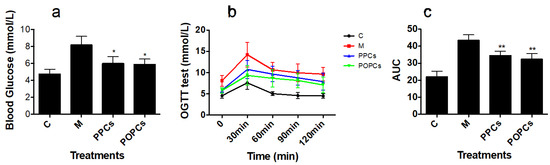 As shown in Figure 2a, the mice in M group showed higher fasting glucose levels (4.76 ± 0.53 vs. 8.17 ± 1.02 mmol/L, p < 0.01), and treatment with P-PCs and P-OPCs showed a significant decrease (5.99 ± 0.63 vs. 8.17 ± 1.02 mmol/L; 5.87 ± 0.52 vs. 8.17 ± 1.02 mmol/L, for P-PCs and P-OPCs, respectively). Compared with that in C group, the blood glucose levels were much higher in the M group after glucose administration (Figure 2b,c). The area under the curve (AUC) of glucose also indicated that both of P-PCs and P-OPCs could improve insulin resistance (AUC: 34.86 ± 1.24 vs. 43.48 ± 2.23 and 32.70 ± 1.82 vs. 43.48 ± 2.23 for P-PCs and P-OPCs, respectively).