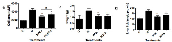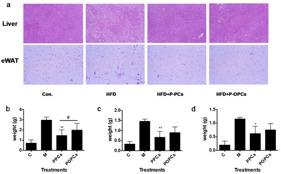 As the results showed in Figure 3a, both P-PCs and P-OPCs could significantly reduce the size and number of lipid droplets observed in the livers and epididymal fat mass. HFD could induce the increase of the weight of inguinal fat mass, epididymal fat mass, and perirenal fat mass, and both P-PCs and P-OPCs could inhibit the expansion of adipose tissue, compared with P-OPCs; P-PCs showed stronger inhibitory potential (Figure 3b–d). In addition, as shown in Figure 3b, the epididymal fat mass weights of mice in PPCs group were significantly lower than that in P-OPCs group (Figure 3b). Both P-PCs and P-OPCs treatment could decrease the cell area of epididymal fat mass induced by HFD, and compared with P-OPCs, P-PCs should stronger inhibitory potential (Figure 3e). In the meanwhile, as shown in Figure 3f,g, P-PCs and P-OPCs significantly decreased the liver weight and inhibited the accumulation of liver lipids compared with M group.
