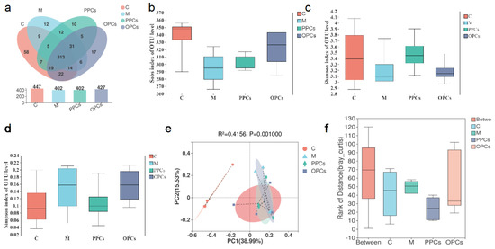 Next, we further explore the impact P-PCs on the gut microbiota composition via 16S rRNA gene sequencing. There were 447, 402, 402, and 427 OTUs in the C group, M group, PPCs, and POPCs groups, respectively (Figure 4a). Accounting for 75% of the total, OTUs (313) were common existing among the four groups. For alpha diversity analysis, P-PCs treatment groups showed higher Shannon index and lower Simpson index compared with that in HFD group, which indicated that P-PCs treatment improved the alpha diversity decreased induced by M (Figure 4b–d). PCoA analysis of the four groups indicated that gut microbiota compositions were independent. The difference in the first (15.53%) and second (38.99%) principal component of gut microbiota indicated the difference in gut microbiota composition. Bray–Curtis assay showed the gut microbiota from C group, gut microbiota of M mice clustered separately with significant difference (Adonis, p = 0.001) (Figure 4e,f). The results showed that HFD intervention significantly changed the composition of the gut microbiota, however, there was no significant difference between P-PCs treatment groups and M group.