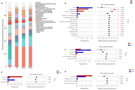 Gut microbiota composition at genus level. (a) Relative abundance of gut microbiota at genus level; (b) the differences of gut microbiota between C and M groups; (c) the differences of gut microbiota between M and PPCs groups; (d) the differences of gut microbiota between different M and POPCs groups; (e) the differences of gut microbiota between different PPCs and POPCs groups. Data were analyzed by Wilcoxon rank-sum test, * p < 0.05.