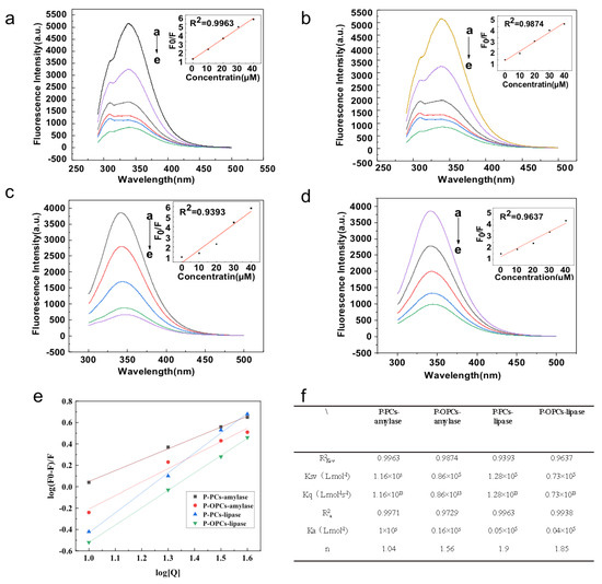 Fluorescence quenching spectra of Key Digestive enzymes at 37°C with P-PCs and P-OPCs. (a,b) Fluorescence quenching spectra of α-amylase at 37 °C with P-PCs and P-OPCs; (c,d) Fluorescence quenching spectra of lipase at 37 °C with P-PCs (c) and P-OPCs (d); (e,f) quenching constant Kq-values of binding between α-amylase and lipase at 37 °C with P-PCs and P-OPCs.