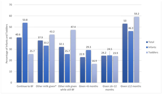 Most of the mothers (31.2%) relied upon information from health professionals for feeding their children, followed by family and friends and social media (28.8 and 27.6%, respectively) (Table 1). Figure 1 shows the types of milk (breastmilk, non-breastmilk, or formula) feeding practices of infants and toddlers in the study. Almost 41% of the total infants and toddlers enrolled in this study were being breastfed (53.8% of infants and 25.7% of toddlers). Most of the infants and toddlers received “other milk” at or after 1 year of age (53%), and almost one-third (33.2%) of the infants were given “other milk”, such as non-breastmilk or formula. An analysis of the introduction of other milk before 6 months of age showed that a higher proportion of infants than toddlers were given other milk (29.3% of toddlers vs. 16.9% of infants, p = 0.032) (Figure 1).