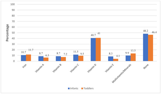 The timing of the introduction of the first animal-based protein foods into the children’s diets according to the knowledge of mothers about iron sources is presented in Figure S2 (Supplementary Materials). A significant percentage of mothers who reported being unaware of iron sources introduced their children to animal-based foods at or after 12 months of age (p = 0.024). Figure 2 shows the prevalence of vitamin and mineral supplement use among 6–12-month-old infants and 1–2.5-year-old toddlers in the study population. Overall, 52.6% of the children received vitamin/mineral dietary supplements (51.8% of infants and 53.6 of toddlers). The most frequently reported supplement given to the infants and the toddlers was vitamin D, followed by vitamin/mineral supplements for toddlers.