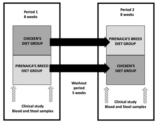 After 8 weeks, participants attended a second visit in the afternoon and the second assessment of the blood extraction and stool sample the following day in the same conditions. Following the cross-over design, participants for the second 8-week period were crossed over to the beef (Pirenaica breed) or chicken-based diet, respectively. The clinical study with all the measurements was done again at the beginning and at the end of the second 8-week period, separating both periods with a 5-week wash out period.