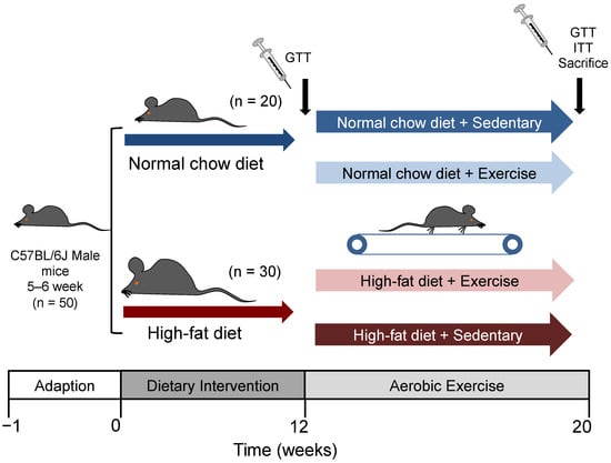 Five-week-old male C57BL/6J mice were obtained from Beijing Huafukang Laboratory Animal Technology Co., Ltd. (Beijing, China) and were housed in a controlled room at 22–25 °C on a 12 h day/night cycle with free access to food and water. After 5 days of acclimation, the mice were randomly divided into two groups. The normal control group (NC, n = 20) continued eating regular food (3.87 kcal/g, 2.79% energy as fat, 1025, Huafukang), while the high-fat diet (HFD, n = 30) group was fed with a high-fat diet (5.24 kcal/g, 60% energy as fat, H10060, Huafukang). IR was diagnosed if the AUC during GTT of the HFD group was 1.2 times higher than that of the NC group. After 12 weeks of diet, the mice were randomly allocated into the following four groups: normal sedentary (NS, n = 8), normal exercise (NE, n = 8), HFD sedentary (HS, n = 8), and HFD exercise (HE, n = 8). Body weight and fasting blood glucose concentration were measured once a week. Blood was collected from the tail vein.