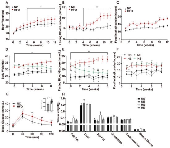 Aerobic exercise attenuated HFD-induced adiposity. (A) Body weight, (B) fasting blood glucose, and (C) food intake during the 12-week feed. (D) Weekly changes in body weight, (E) fasting blood glucose, and (F) food intake during eight weeks of exercise. (G) Glucose tolerance test (GTT) and AUCGTT after 12 weeks of the high-fat diet. (H) Tissue weights of the mice. NC, normal control, n = 20; HFD, high-fat diet, n = 30. NS, normal sedentary; NE, normal + exercise; HS, HFD sedentary; HE, HFD + exercise. Sub Fat, subcutaneous fat, Epi Fat, epididymal fat. Values are means ± SD (n = 8 per group). * p < 0.05, ** p < 0.01 vs. NS group; # p < 0.05, ## p < 0.01 HS group.