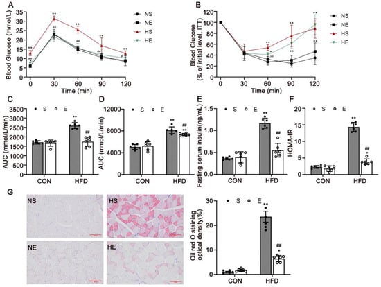 Aerobic exercise improved HFD-induced insulin resistance and dyslipidemia. (A) GTT. (B) Insulin tolerance test (ITT). (C) AUC of GTT. (D) AUC of ITT. (E) Serum insulin level of mice fasted for 12 h. (F) The value of HOMA-IR. (G) Oil Red O staining of lipid droplets in skeletal muscle (scale bar = 100 μm). CON, normal control; HFD, high-fat diet; S, sedentary; E, exercise. NS, normal sedentary; NE, normal + exercise; HS, HFD sedentary; HE, HFD + exercise. * p < 0.05, ** p < 0.01 vs. NS group; # p < 0.05, ## p < 0.01 HS group.