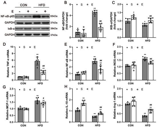 Aerobic exercise ameliorates skeletal muscle inflammation in HFD-fed mice. (A) Western blot images and quantifications of muscle samples, including: (B) NF-κB and (C) IκB-α, n = 6. (D) mRNA expression of TNF-α, NF-κB (E), iNOS (F), MCP-1 (G), IL-10 (H), Arg-1 (I) in skeletal muscle. Values are expressed as the mean ± SD. CON, normal control; HFD, high-fat diet; S, sedentary; E, exercise. * p < 0.05, ** p < 0.01 vs. NS group; # p < 0.05, ## p < 0.01 HS group. n = 6.