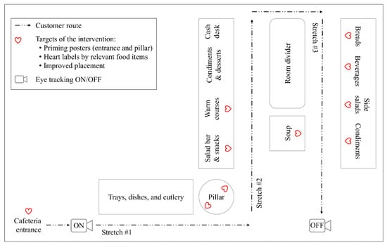 The placement strategy set heart-food items first in line and towards the front row and non-heart-food items last in line and towards the back row within product categories (Table 2). Heart-food snack items were additionally lifted on the top shelf of a display to enable eye-level view. On serving line stretch #2 (Figure 1), the placement manipulation excluded the soup whose position was fixed due to the layout of the serving line. In addition, according to the wishes of the cafeteria staff, the placement of a couple of other warm courses remained suboptimal on two days of the intervention week due to practicalities concerning cleanliness and food sufficiency. Otherwise, the implementation on stretches #1–2 followed plans. According to literature, expecting perfect or near-perfect implementation is unrealistic and unnecessary because few interventions have reached implementation levels closer than 80% of optimal and because studies have yielded positive results with levels around 60% []. We hence considered the implementation on stretches #1–2 overall satisfactory. On serving line stretch #3, however, the implementation faced major challenges throughout the intervention week because most food items kept travelling away from their assigned places and corresponding Heart labels as customers handled them. Such implementation quality was unacceptable, as the findings would not have reflected the intended intervention. Hence, our data analyses considered only data collected at stretches #1–2.