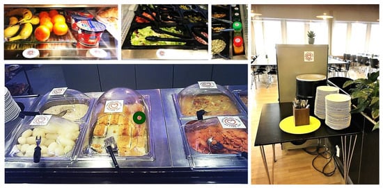 - Rantala, E.; Vanhatalo, S.; Tilles-Tirkkonen, T.; Kanerva, M.; Hansen, P.G.; Kolehmainen, M.; Männikkö, R.; Lindström, J.; Pihlajamäki, J.; Poutanen, K.; et al. Choice Architecture Cueing to Healthier Dietary Choices and Physical Activity at the Workplace: Implementation and Feasibility Evaluation. Nutrients 2021, 13, 3592. [Google Scholar] [CrossRef] [PubMed]