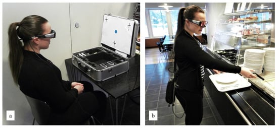 (a) The calibration of eye-tracking glasses; (b) Test subject wearing eye tracking glasses. Images reproduced with the permission of the study cafeteria and the test subject.