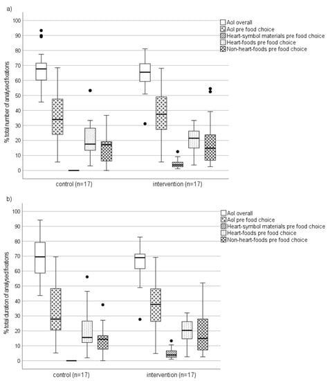 The distribution of (a) total number and (b) total duration of fixations on areas of interest (AoI, i.e., Heart-symbol materials, heart-foods, and/or non-heart-foods) as the percentages of total fixations accumulated at the analysed section of serving line stretch #2. Boxes extend from first to third quartile, horizontal lines across the boxes represent medians, whisker endpoints indicate minimum and maximum values, and dots represent outliers.