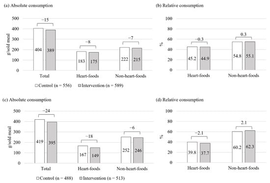 The cafeteria-level consumption of foods available on serving line stretch #2. (a,b) Data covers salad bar items, warm courses, and condiments; (c,d) Data covers warm courses and condiments. In graphs (b,d), numbers above the square brackets denote differences in percentage points.