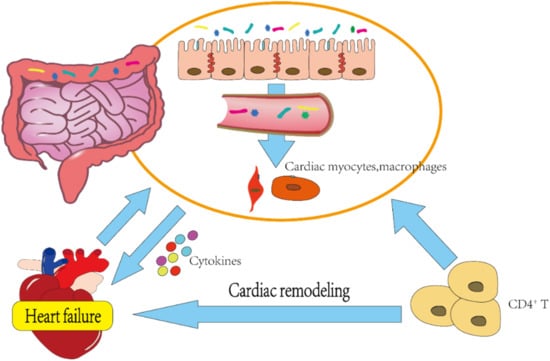 In addition, the gut microbiota interacts with the host immune system in a cyclic manner, [] with one study showing that the adhesion of segmented filamentous bacteria (SFB) to intestinal epithelial cells (ECs) promotes TH17 cell development []. The intestinal commensal colonization of Bacteroides fragilis can activate the TLR pathway to induce regulatory T cells and ultimately establish host–microbe symbiosis []. CD4+ T cell activation is known to be the major cause of cardiac remodeling and fibrosis, and cardiac pressure overload-induced HF leads to specific T-cell activation; whereas the absence of gut microbiota significantly attenuates CD4+ T cell number []. Figure 1 illustrates the gut microbiota, inflammation, and immunity as intertwined processes. Chronic persistent inflammation and immune response eventually generate related cardiac-function suppression, forming a positive-feedback pathway and aggravating HF.