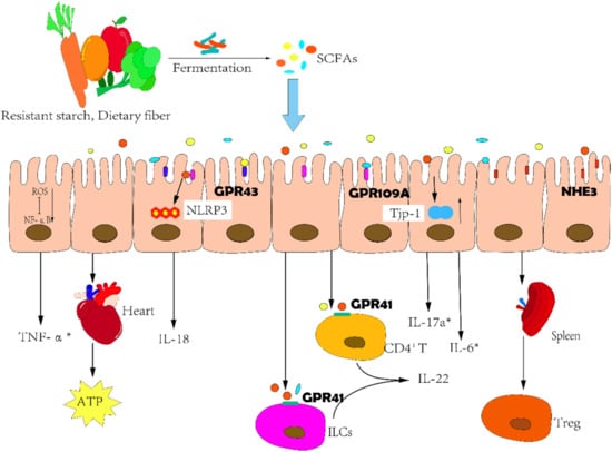SCFAs are saturated fatty acids with six or fewer carbon molecules that are principally produced by the gut microbiota from resistant starch and dietary fiber (such as cellulose, lignin, and pectin) by fermentation and include acetic acid, acrylic acid, butyric acid, valeric acid, and caproic acid []. Broadly speaking, SCFA formation in the colon is largely determined by the type and number of microorganisms, substrate availability, and intestinal transit []. SCFAs are among the most abundant microbial metabolites in the intestinal lumen and comprise important energy substances in the human body. SCFAs are absorbed and metabolized by colonic ECs and provide approximately 10% of the daily energy requirement of adults, with acetate as the primary energy source [].