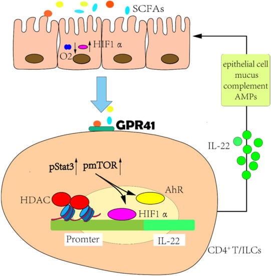 SCFAs promote the production of IL-22. Short-chain fatty acids (SCFAs) promote the expression of hypoxia-inducible factor 1α (HIF1α) and binding to the interleukin-22 (IL-22) by binding to G-protein receptor 41 (GPR41) on the surface of innate lymphoid cells (ILCs) and CD4+ T cells and inhibiting histone deacetylase. Finally, the elevated secretion of IL-22 further improves intestinal function. ↑ denotes increase; ↓ denotes decrease; SCFAs, short-chain fatty acids; GPR41, G-protein receptor 41; IL-22, interleukin-22; AhR, aryl hydrocarbon receptor; HIF1α, hypoxia-inducible factor 1α; HDAC, histone deacetylase; ILCs, innate lymphoid cells; AMPs, antimicrobial proteins.