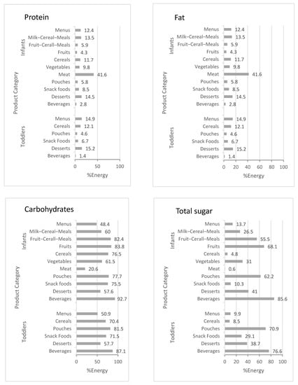 Expressed as % of energy, the highest protein content was found in meat products, followed by menus for infants and toddlers and toddlers’ desserts. Carbohydrate content was lowest in meat (20.6%). In all other product groups, carbohydrates provided between around 50% and 90% of the energy content. In meat products, cereals, and toddlers’ menus, the contribution of sugar to energy content was less than 10%. More than 50 %E sugar was found in pouches, beverages, cereal fruit meals, and fruits (Figure 1).