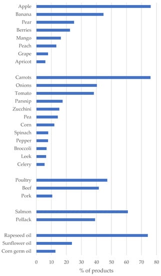 The most frequent ingredients (fruits, vegetable, meat, fish, and fat/oil, listed in at least ≥5% of products) in commercial complementary foods for infants and toddlers, results of a 2020 market survey in Germany (values are % of products containing fruits (i.e., fruit–cereal–meals, fruit products, fruit pouches, milk–cereal–meals in jars; n = 398), vegetables (i.e., menus, vegetables, and vegetable pouches; n = 308), meat (menus and meat products; n = 142), fish (fish menus and fish jars; n = 23), and added fat/oil (in menus and vegetable products; n = 283)).