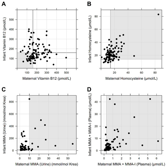 Relation of maternal and infant vitamin B12 status. (A–D) illustrates the correlation of the maternal and infant vitamin B12 status based on the vitamin B12 levels and the functional parameters Hcy, MMA in urine, and MMA or MMA-I in plasma as a point cloud. Bold lines mark the cut-off of the normal range. Individuals in the gray marked area showed values outside the normal range for both mother and child.