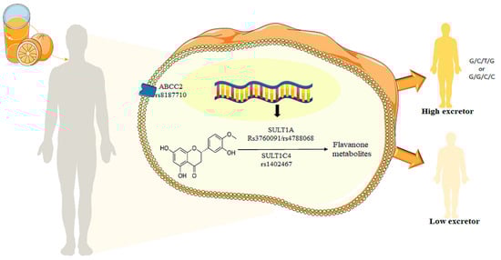 Thus, the aim of this study was to assess the impact of single nucleotide polymorphisms in genes coding for phase II enzyme SULT1A1 and SULT1C4 and transporter ABCC2 on excretion of flavanones phase II metabolites in volunteers after 24 h of orange juice intake.