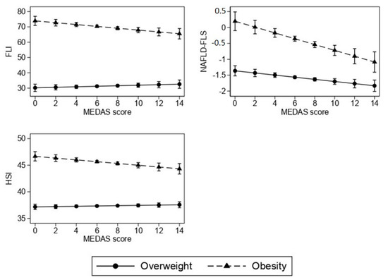 MEDAS was associated with the indices of fatty liver, but the magnitude of the association differed among the BMI classes. In women with obesity, a 1-point increase in MEDAS was associated with a 0.60 reduction in FLI (95% CI: −1.04; −0.16, p = 0.008), a 0.092 reduction in NAFLD-FLS (95% CI: −0.134; −0.049, p < 0.001) and a 0.17 reduction in HSI (95% CI: −0.30; −0.04, p = 0.011). In women with overweight, a 1-point increase in MEDAS was associated with a 0.034 reduction in NAFLD-FLS (95% CI: −0.057; −0.010, p = 0.005), while no association between the MEDAS score and FLI and HSI was found. Figure 1 shows the marginal mean of indices of fatty liver associated with the MEDAS score in women with overweight and obesity.
