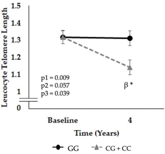 Leucocyte telomere length according to the single nucleotide polymorphism (SNP) rs7069102 genotype located on the SIRT1 gene after the follow-up period. Data are represented as the mean ± SEM and correspond to ANOVA for repeated measures; where p1: time follow-up, p2: genotype influence and p3: the interaction of the two factors (time vs. genotype). When post hoc tests were pertinent, we used multiple comparisons with the Sidak correction. * p < 0.05 4 years vs. baseline, β p < 0.05 genotypes in the same time. The data correspond to the population included in the study where 351 subjects are carriers of the GG genotype (49%) and 365 of the CG + CC genotype (51%) (combined both LF and Med diets).