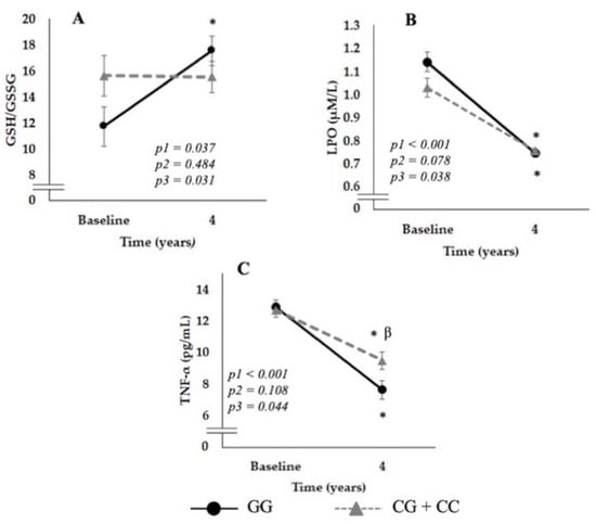 Subjects with the GG genotype showed an increase in GSH/GSSG ratio values compared to their baseline levels (p = 0.003) (Figure 2A). Additionally, the LPO levels decreases in both genotypes (GG and CG + CC) (both p < 0.001), however it decreases more in GG carriers after the intervention period compared to baseline (Figure 2B). Moreover, a significant decrease in TNF-α levels was observed in both the GG and CG + CC genotypes (both p < 0.001, respectively), although this profile was significantly greater in GG homozygotes after 4 years of follow-up (p = 0.022) (Figure 2C).