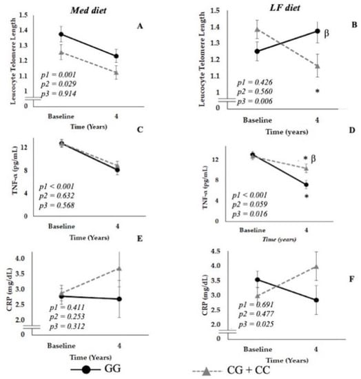 Interaction between diet and aging- and inflammation-related parameters according to SNP rs7069102 genotype located in SIRT1 gene (Panels A,C,E, Mediterranean Diet and Leukocyte Telomere Length, TNF-α and CRP; Panels B,D,F, Low-Fat Diet and Leucocyte Telomere Length, TNF-α and CRP). Data are represented as the mean ± SEM and correspond to an ANOVA for repeated measures, where p1: time of follow-up, p2: genotype influence and p3: the interaction of the two factors (time vs. genotype). When post hoc tests were pertinent, we used multiple comparisons with the Sidak correction. * p < 0.05 4 years vs. baseline, β p < 0.05 genotypes in the same time period.