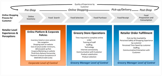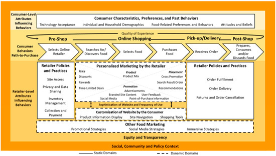 - Khandpur, N.; Zatz, L.Y.; Bleich, S.N.; Taillie, L.S.; Orr, J.A.; Rimm, E.B.; Moran, A.J. Supermarkets in cyberspace: A conceptual framework to capture the influence of online food retail environments on consumer behavior. Int. J. Environ. Res. Public Health 2020, 17, 8639. [Google Scholar] [CrossRef]