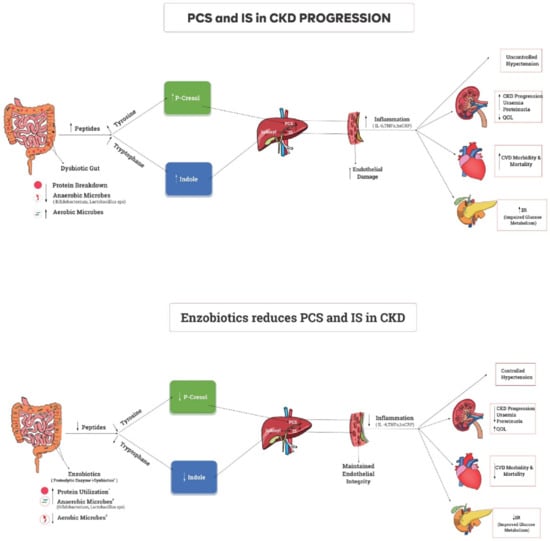 The amounts of nutrients entering the colon mainly depend on dietary intake and the efficiency of the assimilation process in the small intestine. Pancreatic inflammation and malabsorption are often associated with impaired protein digestion in the ESRD population [18]; consequently, changes in the composition of the intestinal flora or changes in intestinal production and absorption alter their serum concentration. Undigested proteins and dysbiosis of the gut in CKD result in the generation of IS from tryptophan and PCS from tyrosine [18,19]. These PBUTs contribute to worsening renal function and CKD progression [20]. PBUTs also increase CVD morbidity and mortality in CKD [20].