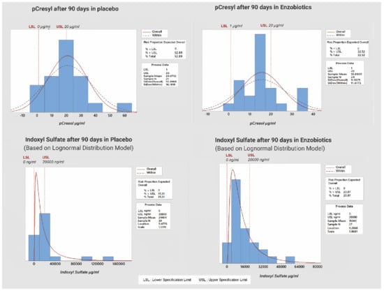 The parametric t-test for the differences of means was used since the Day 90/Day 0 ratio followed a normal distribution. The absolute values of PCS followed normality, while those of IS followed a log-normal distribution. The proportion of patients beyond the risk cutoff level were estimated using capability analysis. The nonparametric Mann–Whitney test was used in non-normal cases. The improvement ratio in PCS and IS on Day 90 compared to Day 0 was recorded for the enzobiotic and placebo groups (1, no change; >1, adverse outcome; <1, improvement). The normality and homogeneity of variance (F-ratio) for initial observations (Day 0) in both groups were analyzed for randomness. The cutoffs for risk of CKD progression and CVD in the study were established at PCS > 20 µg/mL and IS > 20,000 ng/mL. These values were determined from the multiple regression for the prediction of toxin on Day 90. The improvements in PCS and IS were compared with the normal range using capability analysis after treatment to identify potential risks in both groups. A two-sample t-test was used to test the significance of differences between both groups in terms of the Day 90/Day 0 ratio, after verifying for normality.