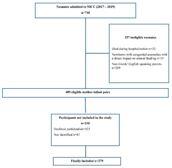 Almost 10–12% of neonates born in the United States are preterm, and admission to NICUs is necessary for many of them [17]. Approximately 10% of full-term neonates require more-advanced-than-usual medical care, and a large proportion of them is also admitted to NICUs. Hospitalized neonates represent a population with a higher risk of adverse short-term and long-term outcomes than healthy full-term neonates [18,19,20]. Admission to NICU has been suggested as a primary inhibiting factor in establishing breastfeeding, with neonates admitted to NICUs presenting lower rates of breastfeeding than healthy neonates [21,22,23,24,25]. Probable causes of this phenomenon include the separation of the mother and the neonate; the stress and anxiety of the mother, which may result in depressive disorder; and the clinical status of the mother and/or the neonate [26,27,28,29]. Until now, in Greece, the direct impact of postnatal mother–neonate separation in establishing and maintaining breastfeeding in neonates admitted to NICUs is largely unknown and needs to be further investigated.