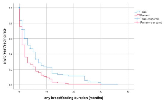 Multiple studies have investigated risk factors for breastfeeding practices. A Lancet series in 2016 reported a wide range of historical, socioeconomical, cultural, and personal prognostic factors for breastfeeding practices [49]. There is evidence that cesarean section has a negative impact on the initiation and duration of breastfeeding, especially if it has been performed under general or spinal anesthesia [50,51]. This finding was attributed to the lower maternal prolactin levels, the post-operative pain and, particularly, to the delayed contact of the mother with the neonate. The labor mode was not associated with the duration of breastfeeding in our study. That could have been due to the fact that both preterm and full-term neonates who had been admitted to the NICU had failed to achieve the early skin-to-skin contact with their mothers and that the initiation of breastfeeding was delayed compared with healthy neonates.