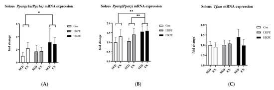 3.6. Effect of Exhaustive Exercise and KPE Administration on Mitochondrial-Function-Related Gene Expression in Soleus Muscle