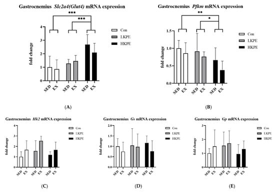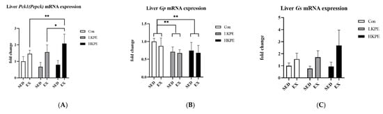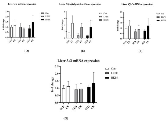 3.8. Effect of Exhaustive Exercise and KPE Administration on Glycogen-Metabolism-Related Gene Expression in Liver