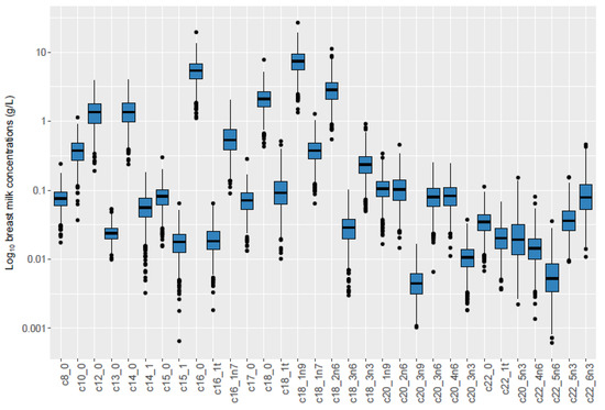 Boxplot of TGFA concentrations in study population (n = 789) 1. Legend: 1 X-axis represents TGFAs measured in milk samples. Y-axis represents log10 of breast milk concentration.