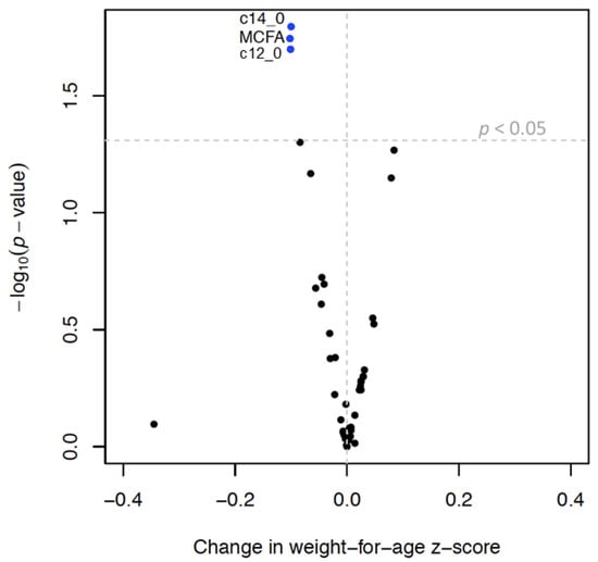 Volcano plot 1 showing associations 2 between triglyceride fatty acid (TGFA) composition in milk and infant growth 3. Legend: 1 Each dot represents change in weight-for-age z-score (x axis) per interquartile range (IQR) increase in TGFA composition. Y-axis represents the −log10 of the p-value. The vertical dotted line represents a beta coefficient of 0 and the horizontal dotted line represents a p-value of 0.05, so that dots above that line represent associations that have a p-value < 0.05. 2 Models were run in the multiply imputed data set (n = 789) in 10 imputed sets and adjusted for maternal age, smoking, education, pre-pregnancy body mass index, gestational weight gain, parity, and child sex. 3 Infant growth defined as change in weight-for-age z-score between 0 and 6 months.