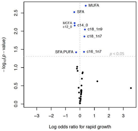 Volcano plot 1 showing associations 2 between triglyceride fatty acid (TGFA) composition in milk and rapid growth 3 Legend: 1 Each dot represents change in the log of the odds ratio (OR) for rapid growth (x axis) per interquartile range (IQR) increase in TGFA. Y-axis represents the −log10 of the p-value. The vertical dotted line represents an OR of 1 and the horizontal dotted line represents a p-value of 0.05, so that dots above that line represent associations that have a p-value < 0.05. 2 Models were run in the multiply imputed data set (n = 789) in 10 imputed sets and adjusted for maternal age, smoking, education, pre-pregnancy body mass index, gestational weight gain, parity, and child sex. 3 Defined as change in weight-for-age z-score between 0 and 6 months > 0.67.