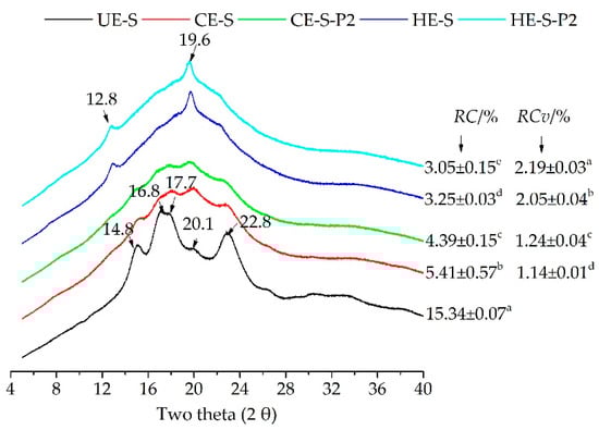 XRD pattern of native buckwheat starch, cold and hot extruded noodles with starch, and phenolic extracts. UE-S, unextruded (native) buckwheat starch; CE-S, cold extruded noodles with starch only; CE-S-P2, cold extruded noodles with starch and phenolics (2.0%); HE-S, hold extruded noodles with starch; HE-S-P2, hold extruded noodles with starch and phenolics (2.0%); RC, relative crystallinity; RCv, relative crystallinity of V-type crystallites. Different letters in a column represent values that are significantly different (p < 0.05).