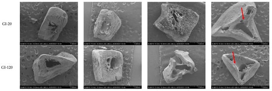 Figure 2 illustrates the morphology of the cold and hot extruded noodles and residues during gastrointestinal digestion to visually observe the morphological changes in cooked and digested noodles. Compared to uncooked noodles, all cooked noodles displayed more irregular holes with the rough and discontinuous network, particularly in the inner noodles, which is consistent with our previous report [], attributed to the penetration of water during cooking of noodles. After gastrointestinal digestion, intensive pores appeared in the outer noodles, and irregular holes became larger, particularly in the hot extruded samples, possibly attributed to acid hydrolysis of starch [,,] or the physical or chemical breakdown under gastric acidic and shaking conditions []. Enzymatic hydrolysis of starch by α-amylase and α-amyloglucosidase into glucose units mainly occurs in the small intestine. The noodles gradually lost their original shape when starch was digested in the small intestine phase from 0 min to 120 min. Of note is that hot extruded phenolic-enhanced noodles seemed to have more matrix left (red arrows) after digestion, which was consistent with the lower digestibility of starch mentioned above.