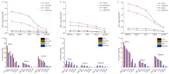 The changes of rutin, vitexin, and hyperin in the unbound, bound, and total phenolic fractions of extruded noodles and their residues during in vitro gastrointestinal were monitored (Figure 3D–F). Among the three phenolics, rutin was the most abundant profile in unbound, bound, and total phenolic fractions. In addition, phenolic profiles in all phenolic fractions of CE-S and HE-S before and after digestion were not detected. Therefore, the variation of rutin content in phenolic-enhanced noodles (CE-SP2 and HE-S-P2) during whole digestion was mainly analyzed.