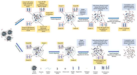 The phenolics in extruded starchy noodles may exist in unbound and bound forms, that is, unbound phenolics embedded on the surfaces of the starch matrix (form I) and physically embedded inner starch matrix (Form II), as well as bound phenolics forming non-inclusion complexes with amylopectin (form III) or amylose (Form IV) or inclusion complexes with amylose (Form V) (Figure 4). The structural characteristics need to be identified.