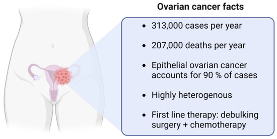 Ovarian cancer (OC) is the seventh deadliest and the eighth most common cancer in women, affecting 313,000 women and causing 207,000 deaths in 2020 (International Agency for Research on Cancer). OC is also called the “silent killer” because it is usually diagnosed at a late stage when the chances of a cure are already very low. Most OCs are diagnosed at stage III (51%) or IV (29%), where the 5-year survival is only 42% or 26%, respectively [1]. See Figure 1 for the most important facts of ovarian cancer. Ovarian tumors arise not only, as previously thought, in tissues of the ovary, but recent data shows that in some cases they can also start in the distal fallopian tube [2]. OC is a highly heterogeneous disease. Heterogeneity is high not only among the different types of ovarian tumors, but also within a single tumor [3]. Based on its origin, OC has seven histological types: epithelial tumors, mesenchymal tumors, mixed epithelial and mesenchymal tumors, sex cord stromal tumors, germ cell tumors miscellaneous tumors, and tumor-like lesions [4]. Around 90% of all ovarian tumors are of epithelial origin [5]. Because of their high heterogeneity, epithelial ovarian carcinomas (EOC) are divided into subgroups by the World Health Organization according to cell type: serous tumors, mucinous tumors, endometroid tumors, clear cell tumors, seromucinous tumors, Brenner tumors, and other carcinomas [4]. According to the International Federation of Gynecology and Obstetrics (FIGO), OC has four stages based on macroscopic and microscopic examination before and after surgery as well as cytology [6]. At stage I and II, the tumor is present mainly in ovaries and fallopian tubes, whereas at stage III it has spread already to local lymph nodes and peritoneum outside the pelvis. At the highest stage IV, distant metastases are present [7].