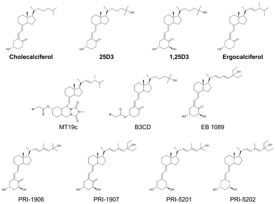 The main function of 1,25D3 is to maintain the proper levels of calcium and phosphorus in serum. Thus, higher doses of 1,25D3, which would be effective against cancer, can cause hypercalcemia as a side effect. For this reason, various synthetic vitamin D analogs have been developed (representative structures of parent compounds and analogs are shown in Figure 2). MT19c is a vitamin D2 (the plant-derived ergocalciferol) derivate, created by Diels–Alder cycloaddition of N-methyl,1,2,4-triazolinedione and esterification with bromoacetic acid [13]. This last modification is shared with the analog B3Cd, which is a 3-bromoacetoxy derivative of 25D3 [14]. EB1089 was one of the first developed vitamin D analogs. It is based on the 1,25D3 structure by elongating the side chain by one carbon and the introduction of terminal ethyl groups and introduction of double bonds at positions 22 and 24 [15]. The PRI-1906 and PRI-1907 analogs were designed based on the 1,25-hydroxylated form (1,25D2) of the plant-derived vitamin D2 (ergocalciferol), with an extended side chain and introduced double bonds. PRI-1906 carries terminal methyl and PRI-1907 ethyl groups [16]. The analogs PRI-5201 and PRI-5202 are based on PRI-1906 and PRI-1907 by removing the methylidene group of the A-ring [17].